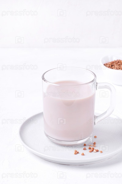 Гречневое молоко в стеклянной кружке на белом столе. Веганское молоко без лактозы