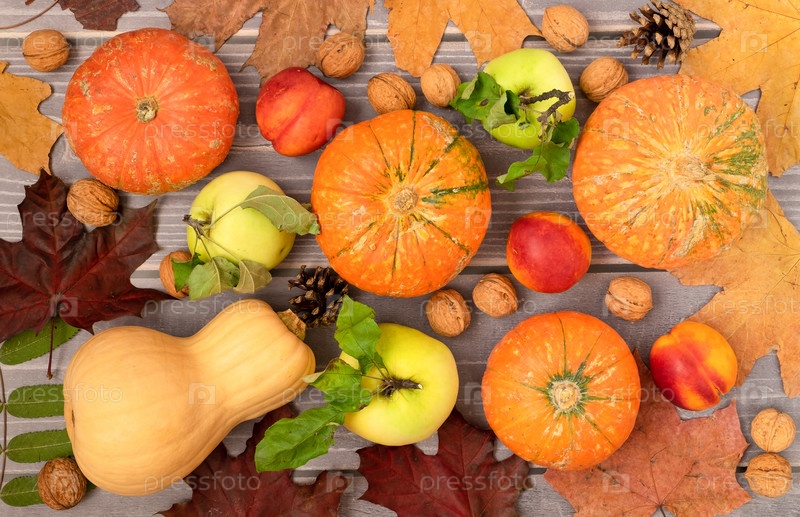 Осенний фон из спелых красивых маленьких тыкв, сезонных фруктов и осенних листьев на деревянном фоне. Урожай, осень, правильное питание