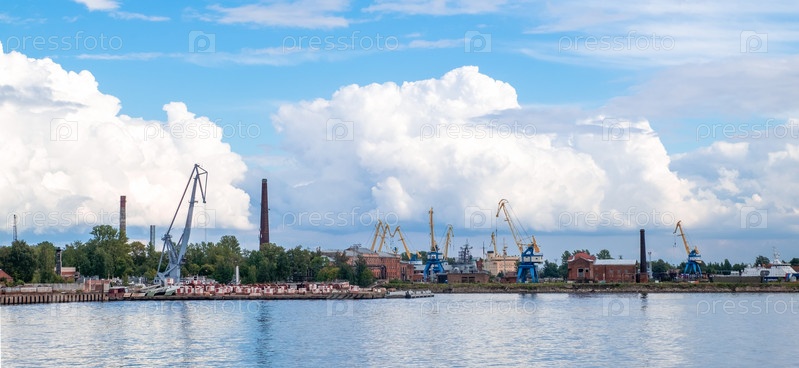 Торговый порт с причалами, кораблями и кранами в зоне погрузки по акватории порта на фоне красивых кучевых облаков