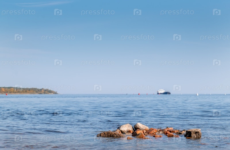 Вид на большое озеро с грузовым кораблем и берег с лесом