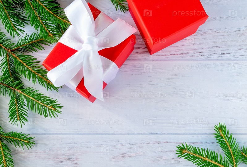 Еловые веточки и подарки разложены на деревянной поверхности, выкрашенной в синий цвет. Рождество, новогодняя концепция