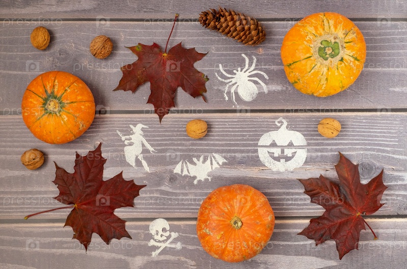 Хэллоуин фон из спелых маленьких тыкв, грецких орехов, опавших красных кленовых листьев и трафаретных символов Хэллоуина