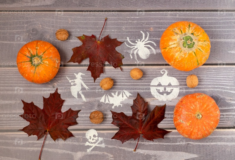Хэллоуин фон из спелых маленьких тыкв, грецких орехов, опавших красных кленовых листьев и трафаретных символов Хэллоуина