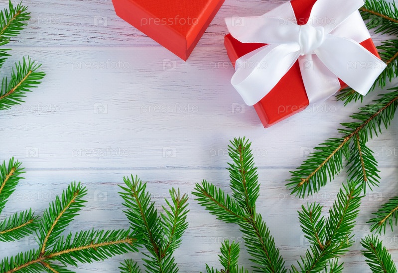 Еловые ветки и подарки разложены на деревянной поверхности, окрашенной в синий цвет