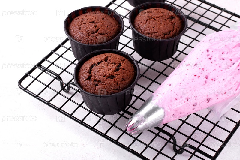 Шоколадные кексы и взбитые ягодные сливки в кондитерском мешке на охлаждающей стойке. Приготовление десерта