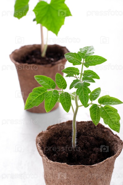 Рассада помидоров в торфяном горшке на белом столе. Садоводство и весенняя посадка. Росток огурца на заднем плане