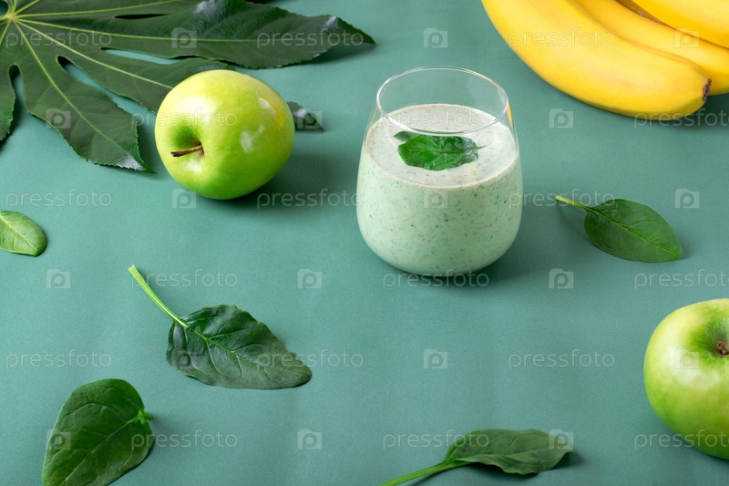Зеленый коктейль с яблоком, шпинатом и бананом на зеленом фоне. Здоровое питание. Купажированный напиток