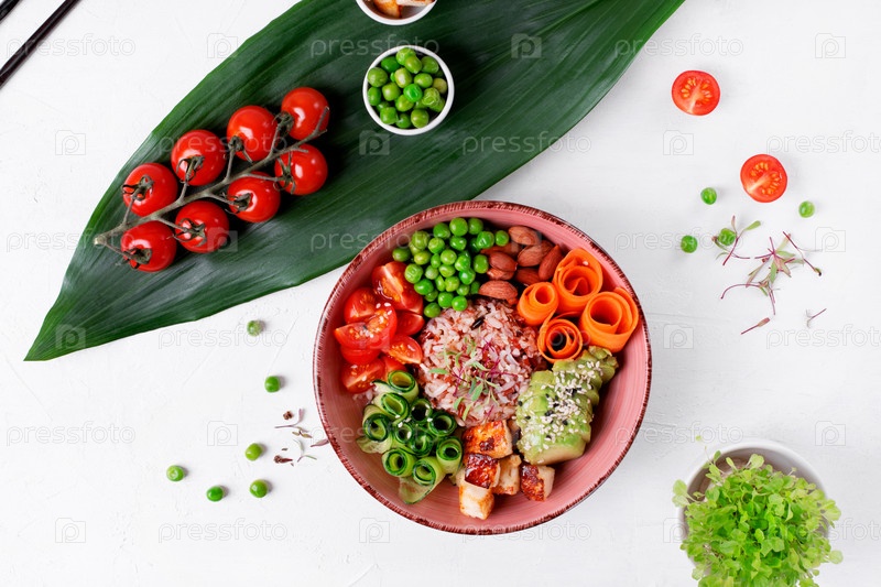 Веганская поке с жареным тофу, помидорами, морковью, авокадо, рисом, огурцом, зеленым горошком и миндалем на белом столе