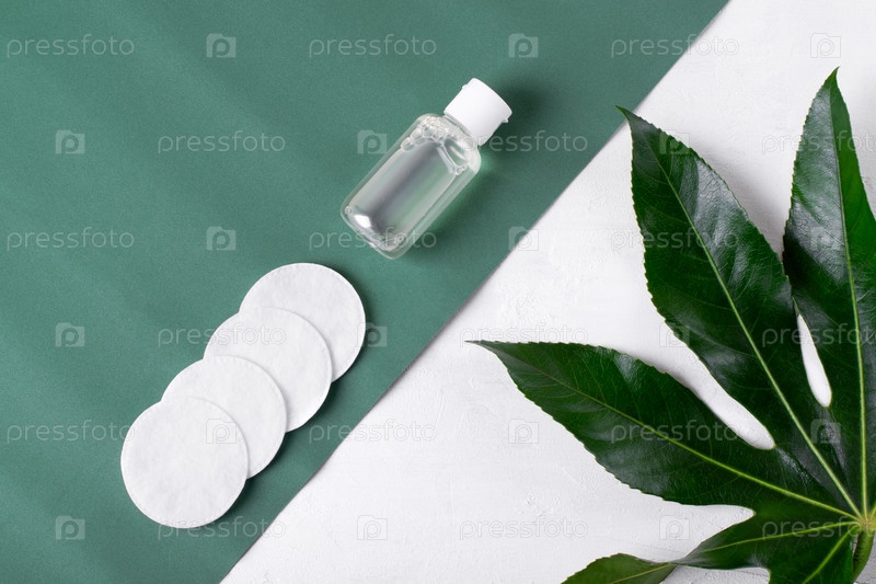 Средство для снятия макияжа в маленькой бутылочке и ватные диски на зеленом и белом фоне. Очищающее средство по уходу за кожей