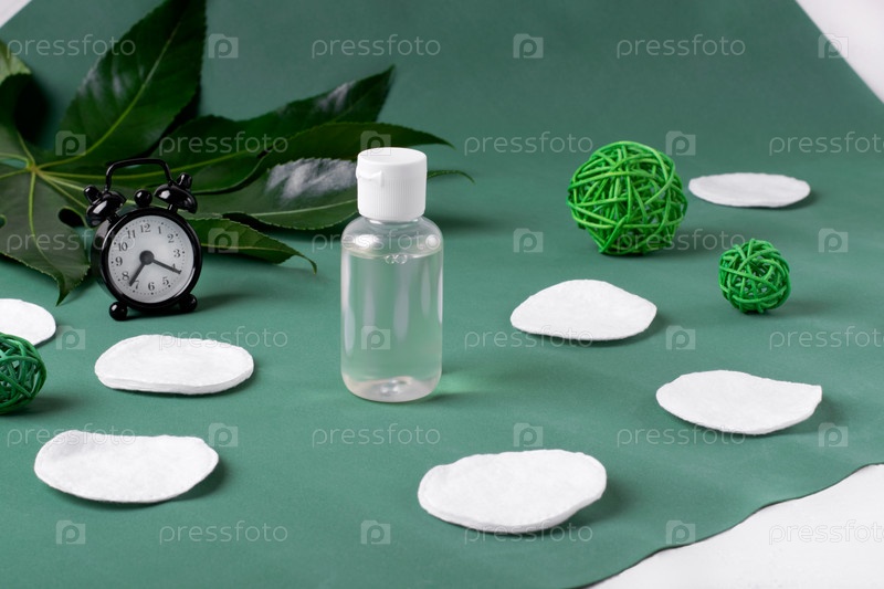 Средство для снятия макияжа в маленькой бутылочке, будильник и ватные диски на зеленом. Очищение кожи на ночь и утром