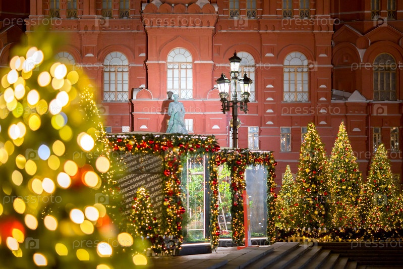 Новогоднее украшение Красной площади. Гирлянды, елочки, огоньки. Красивые праздничные пейзажи в городе Москве. Россия
