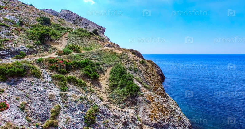 Морской пейзаж с видом на горы, покрытые растительностью