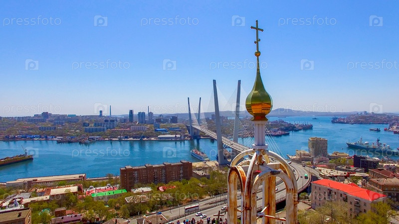 Вид с воздуха на панораму города с видом на Золотой мост
