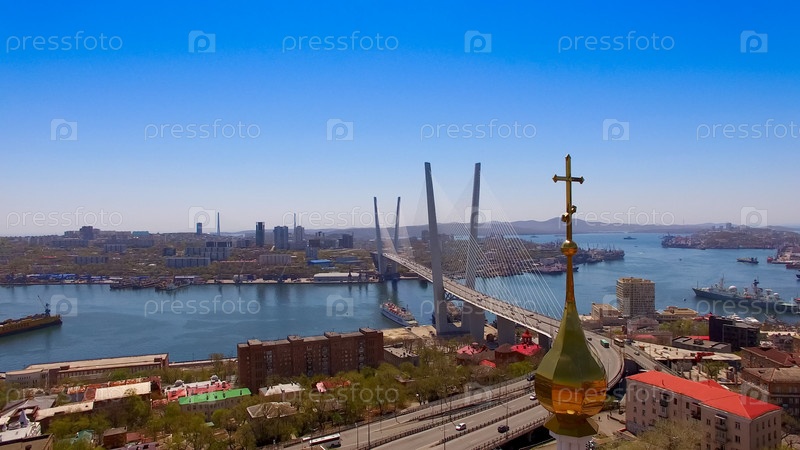 Вид с воздуха на панораму города с видом на Золотой мост
