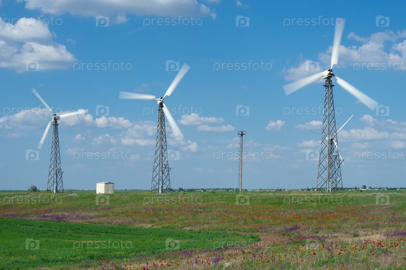 Пейзаж с ветряными электростанциями на фоне зеленого поля