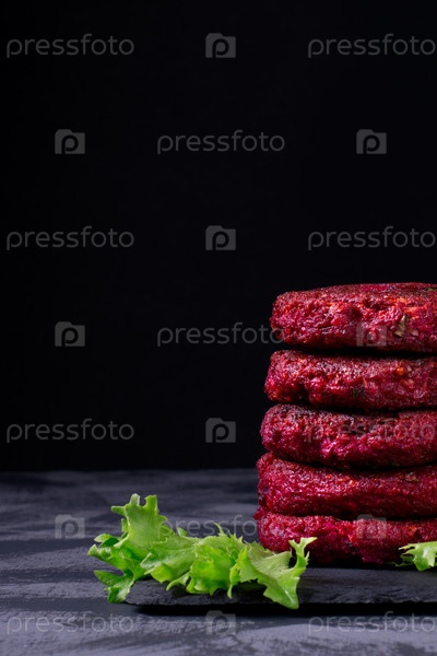 Веганские бургеры из свеклы в стопке на темном фоне. Здоровая альтернатива. Скопируйте пространство. Фотография в низком ключе