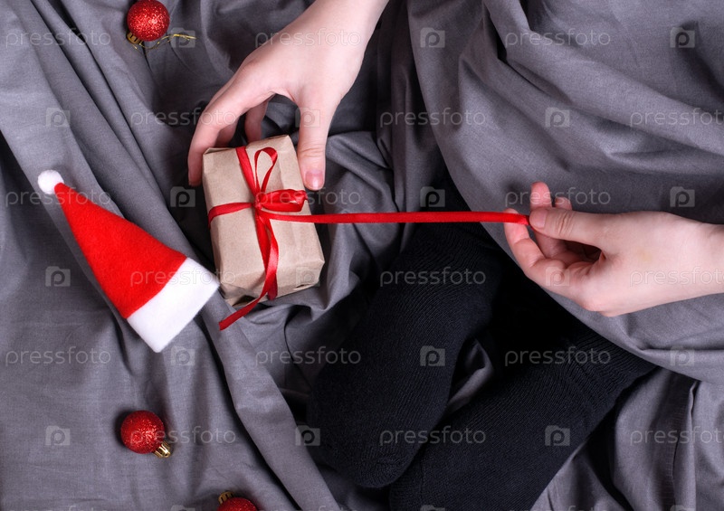 Женщина разворачивает подарочную коробку с красной лентой, сидя в постели. Утро Рождества или Нового года