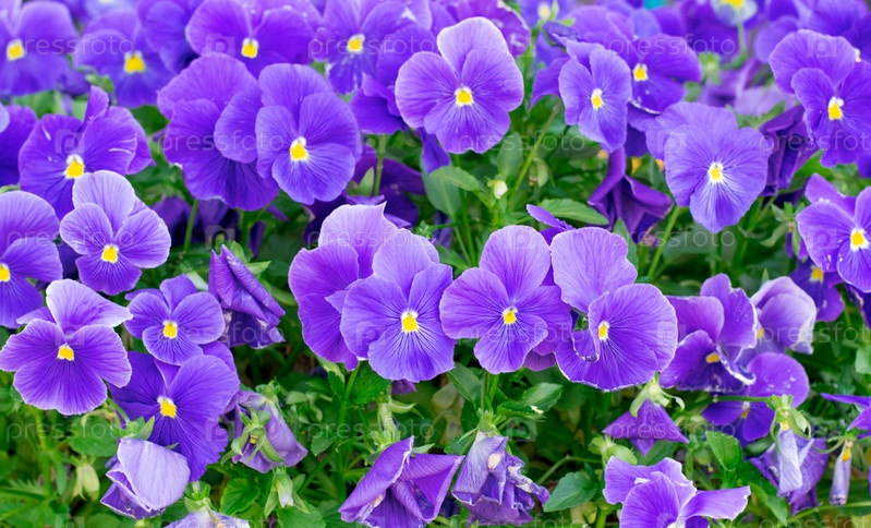 Фиолетовые анютины глазки на клумбе. Красочный цветочный фон