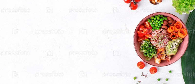 Чаша с жареным тофу, помидорами, морковью, авокадо, рисом, огурцом, зеленым горошком и миндалем на белом столе. Веб-баннер с копией пространства