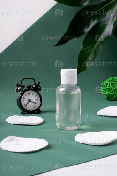 Средство для снятия макияжа в бутылочке, будильник и ватные диски на зеленом фоне. Очищение кожи на ночь и утром