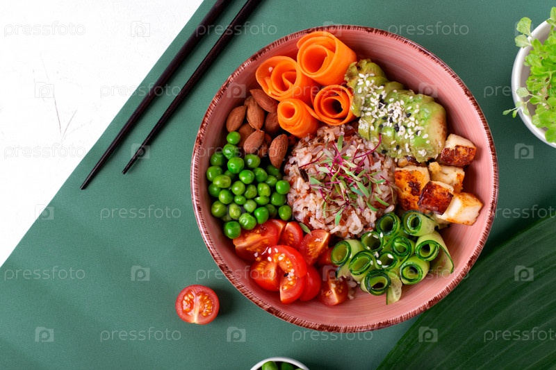 Чаша с жареным тофу, помидорами, морковью, авокадо, рисом, огурцами, зеленым горошком и миндалем. Здоровый салат