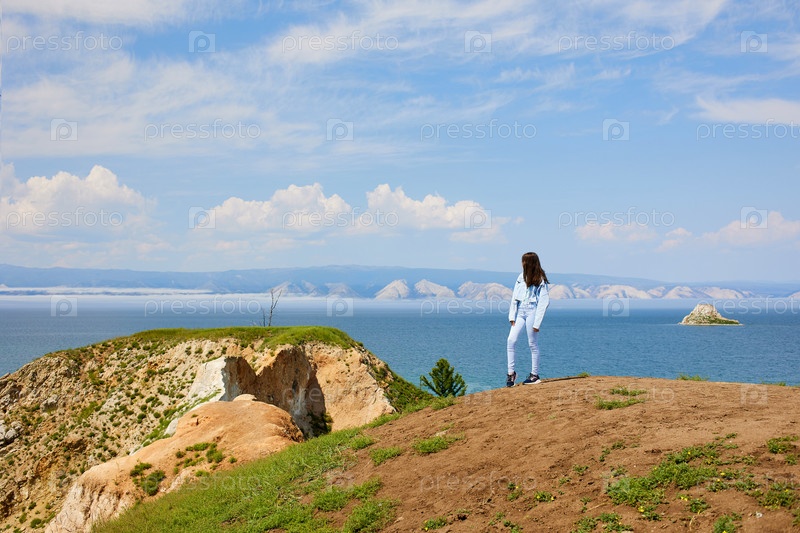 Летом молодая девушка позирует на берегу Байкала. Красивый пейзаж острова Ольхон