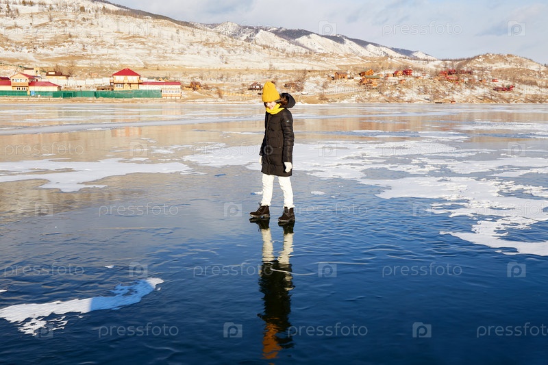 Счастливая девушка ходит по льду замерзшего озера Байкал и смотрит на свое отражение в прозрачном льду