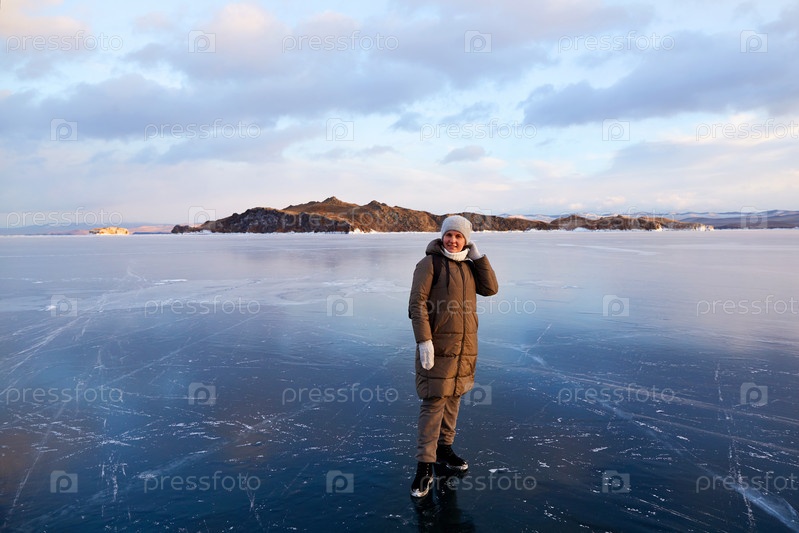 Женщина любуется замерзшим Байкалом. Прозрачный лед