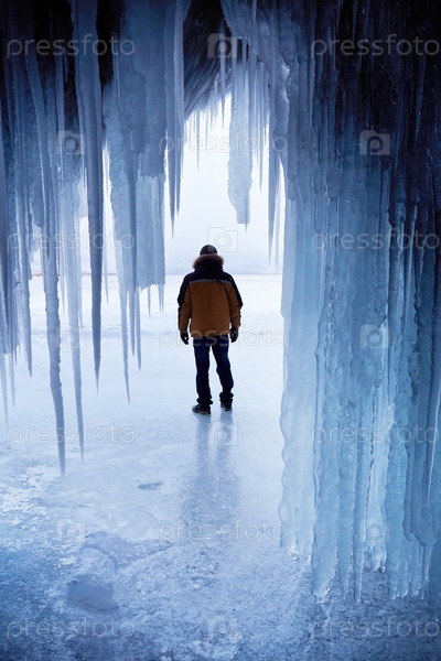 Вид из ледяной пещеры с сосульками на замерзшее озеро Байкал. Мужчина путешествует зимой