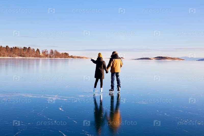 Молодая пара катается на коньках по замерзшему озеру Байкал. Прозрачный лед