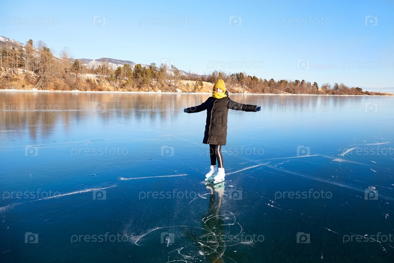 Молодая счастливая девушка катается на коньках по прозрачному льду замерзшего озера Байкал в солнечный зимний день