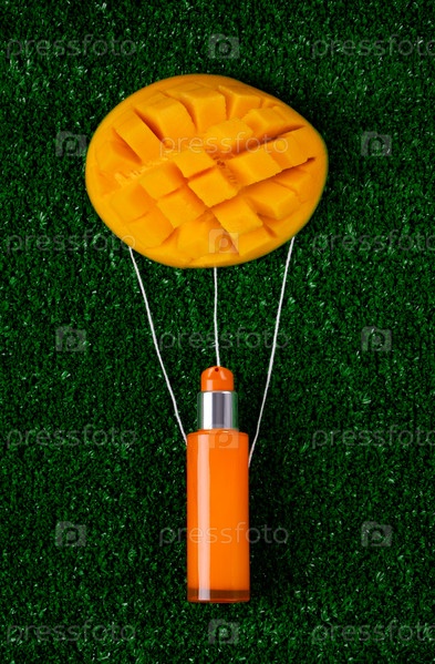 Средство по уходу за телом с манго. Оранжевая бутылка-дозатор и фрукты, делающие воздушный шар на траве. Немаркированный контейнер с гелем для душа, увлажняющим кремом или шампунем. Креативная презентация