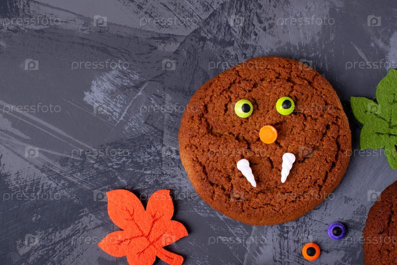 Печенье-монстр на Хэллоуин, украшенное сахарными глазами и клыками, окруженное игрушечными осенними листьями. Вид сверху. Праздничное лакомство для детей