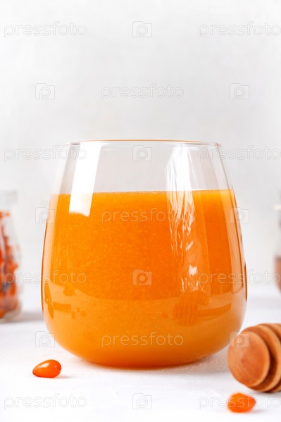 Смузи из облепихи с имбирем, медом и корицей в стакане на белом столе
