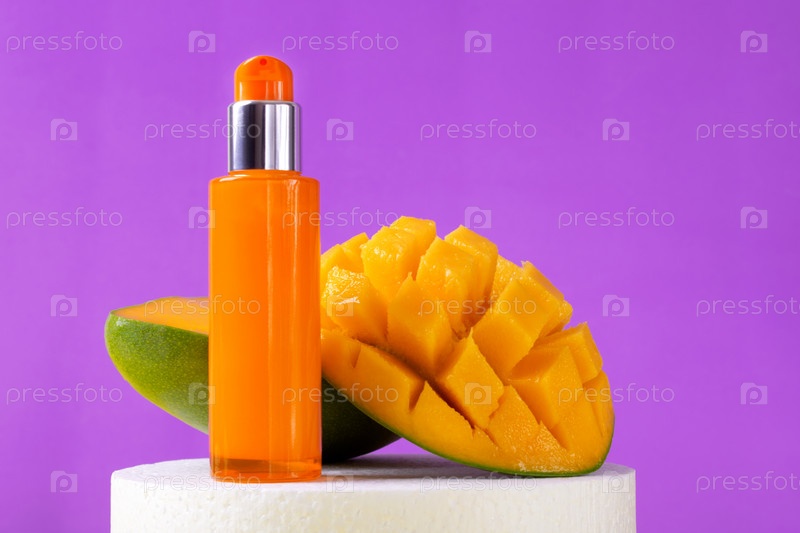 Средство по уходу за кожей с манго. Оранжевая бутылка-дозатор и фрукты на фиолетовом. Немаркированный контейнер для увлажняющего крема, жидкого мыла, шампуня или геля для душа