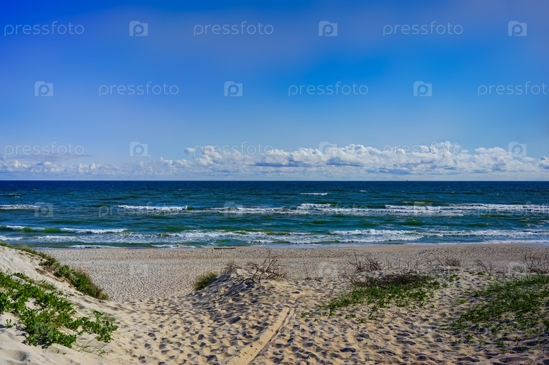 Морской пейзаж Балтийского моря с прибрежными песчаными дюнами Куршской косы
