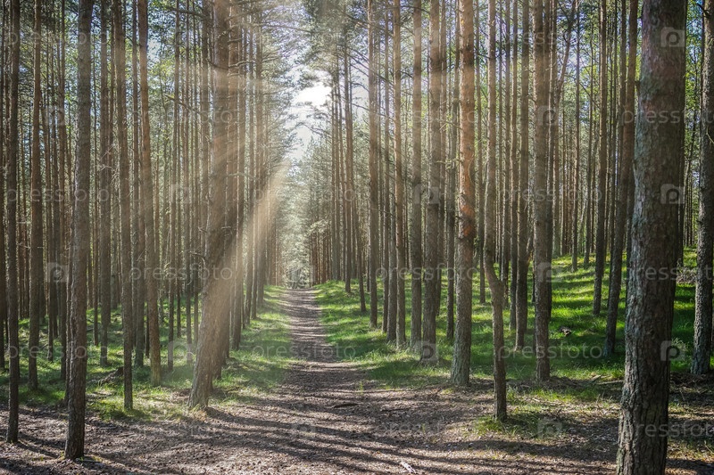 Яркое солнце, просачивающееся сквозь листву деревьев в лесу
