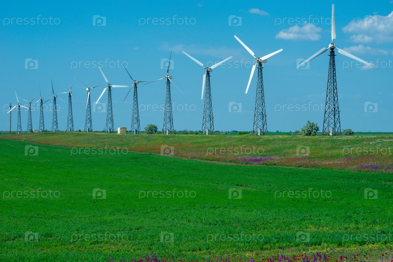 Пейзаж с ветряными электростанциями на фоне зеленого поля