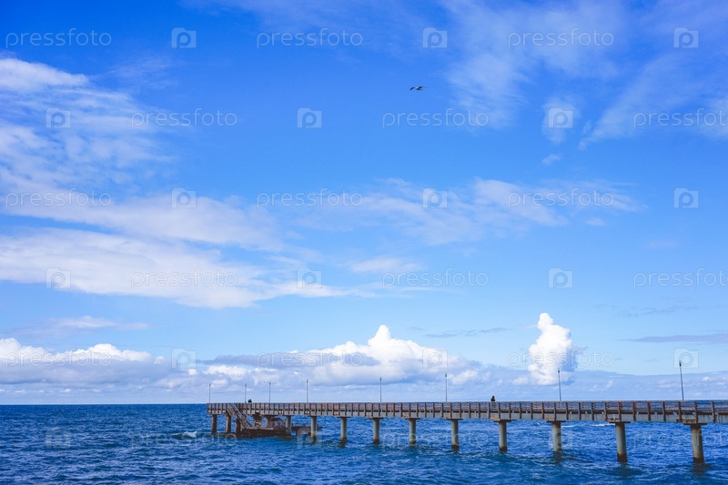 Морской пейзаж с видом на длинный пирс курортного городка с гуляющими людьми