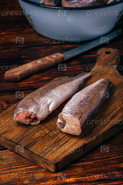 Тушки хека на разделочной доске