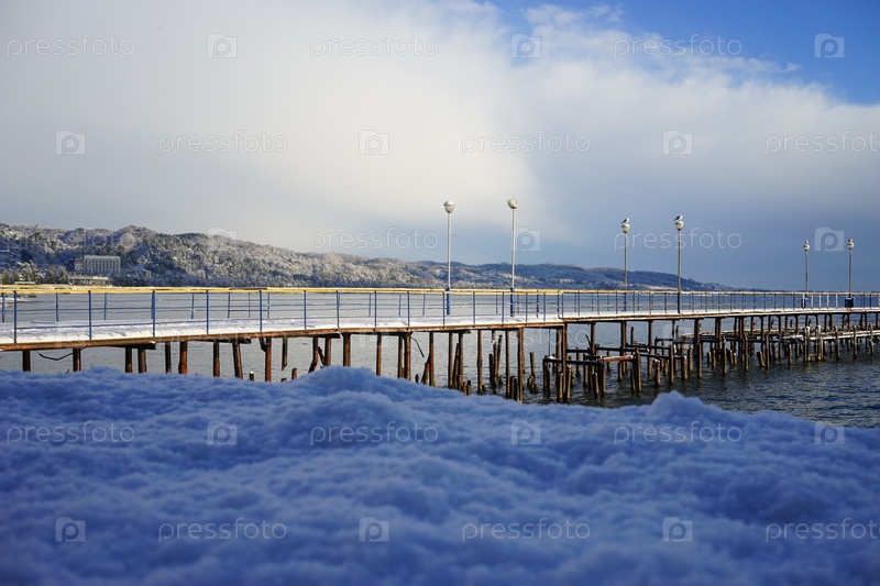 Морской пейзаж со старым разрушенным пирсом на фоне заснеженных холмов