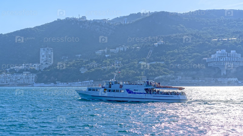 Ялта, Крым - 12 июня 2021 г.: Морской пейзаж с видом на прогулочный катер на фоне города