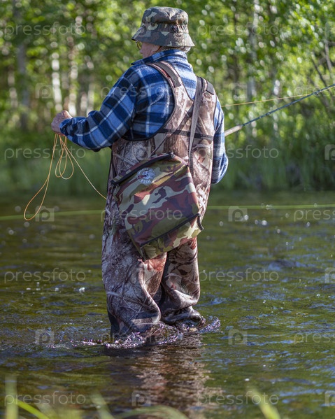 Рыбак в горной реке ловит форель, утро. Вид сбоку