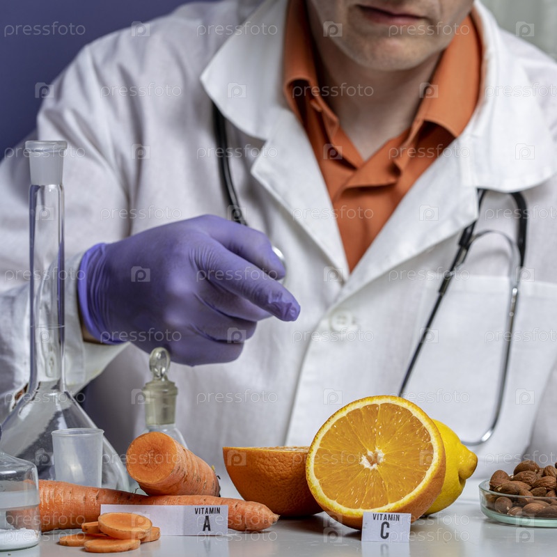 Апельсины на лабораторном столе с названием витамина. Необходимые витамины. Доктор в лаборатории пищевых продуктов