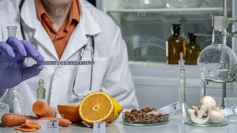 Апельсины, грибы, орехи и морковь на лабораторном столе с названиями витаминов. Необходимые витамины. Доктор в лаборатории пищевых продуктов
