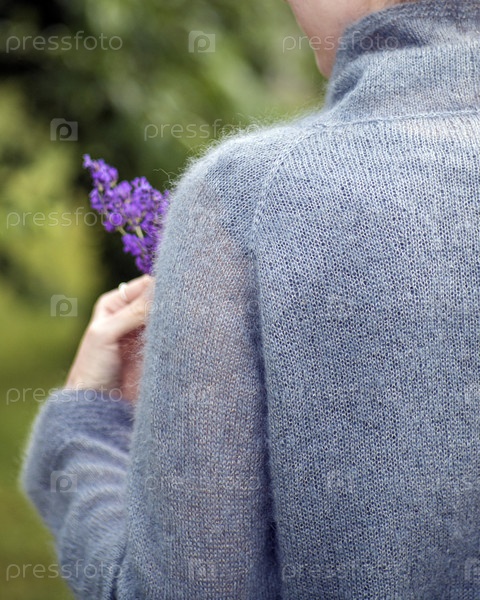 Красивая женщина в сером прозрачном ангорском свитере держит в руках цветы лаванды