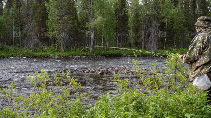 Рыбак в горной реке ловит форель, утро. Вид сбоку
