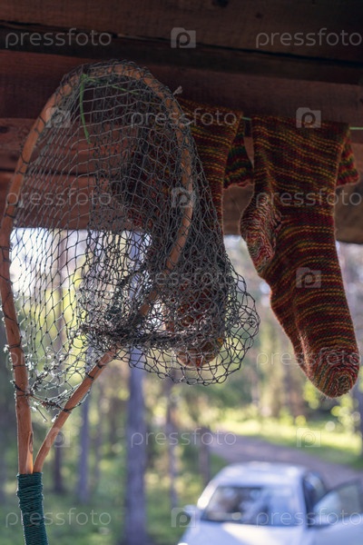 Сачек висит и сохнут теплые носки после удачной рыбалки на реке