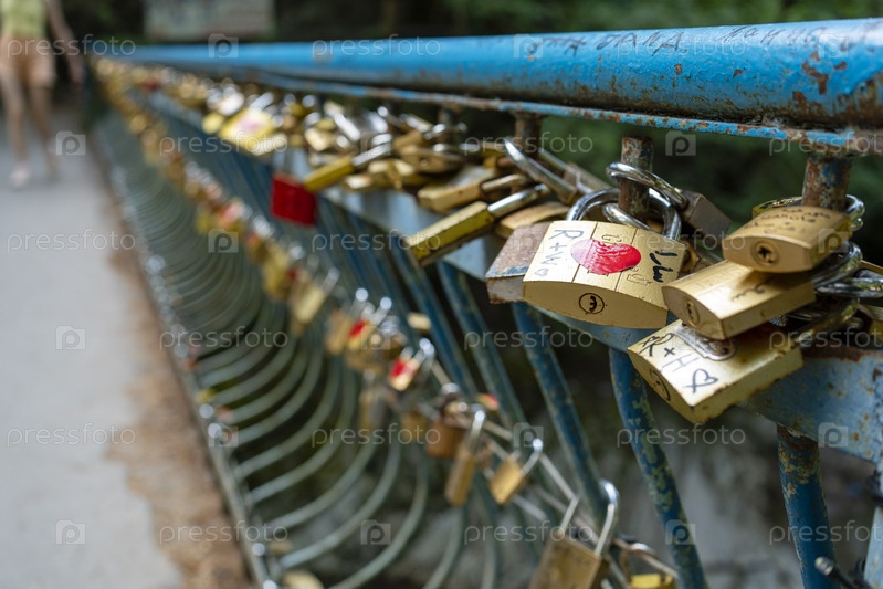 Замки любви на мосту в центральном парке Боржоми в Грузии Выборочный фокус
