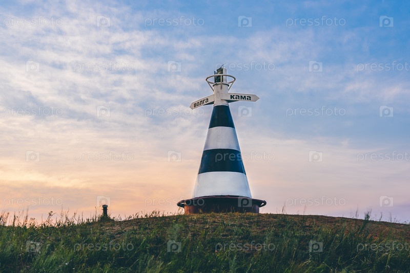 Маяк с указателем на холме в свете заката
